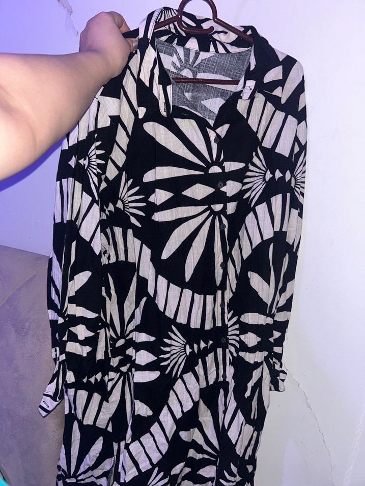 Kadın gömleği, midi boy ve bol kesimdir. Uzun kollu, V yakalı ve düğmelidir. Siyah tonlarda tie-dye deseniyle bohem ve sokak stiline uygundur.