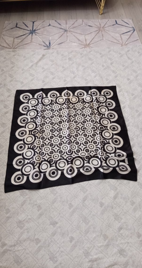 Yumuşak sentetik kumaştan, vintage dairesel desenli, fırfırlı siyah bohem fular.