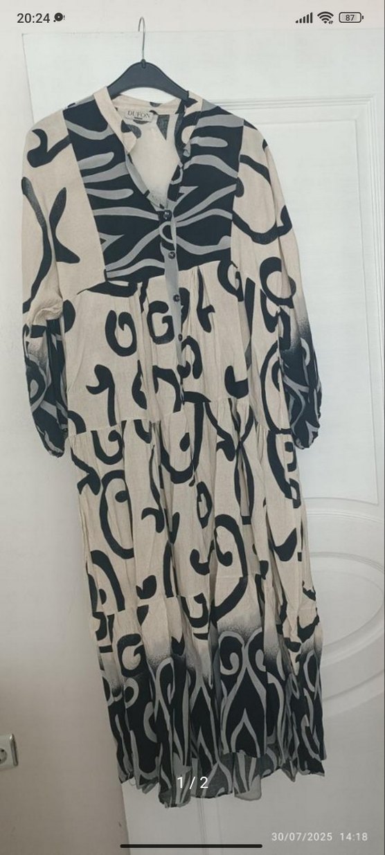 Bohem tarzda, keten kumaştan, siyah ve gri batik desenli, V yakalı, askılı ve bol kesim uzun elbise.