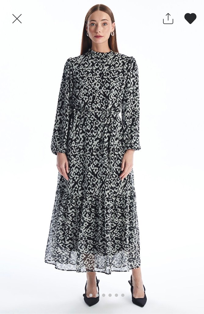 Kadınlar için uzun, bol kesim, yüksek yakalı, uzun kollu siyah-gri yılan desenli elbise. Sentetik kumaştan, fırfır detaylı, ofis için uygun.
