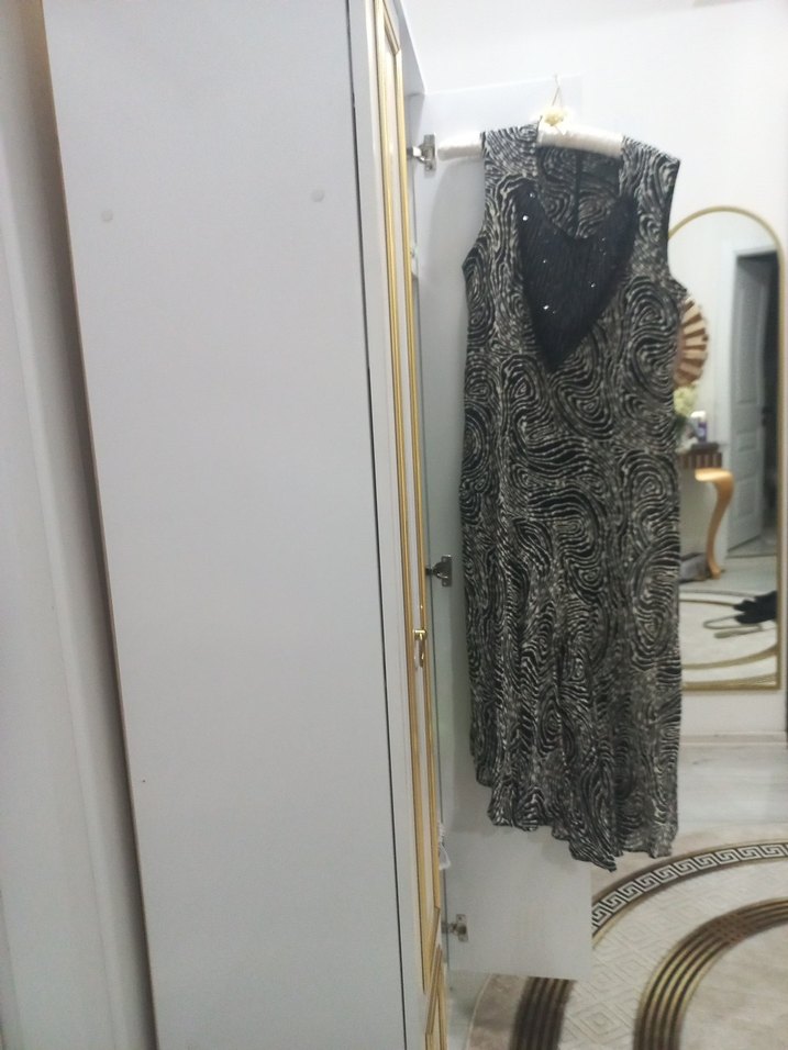 Siyah gri yılan desenli, askısız, V yakalı, bol kesim ve drapeli uzun elbise. Pürüzsüz sentetik kumaştan, günlük kullanıma uygun bohem tarzda.
