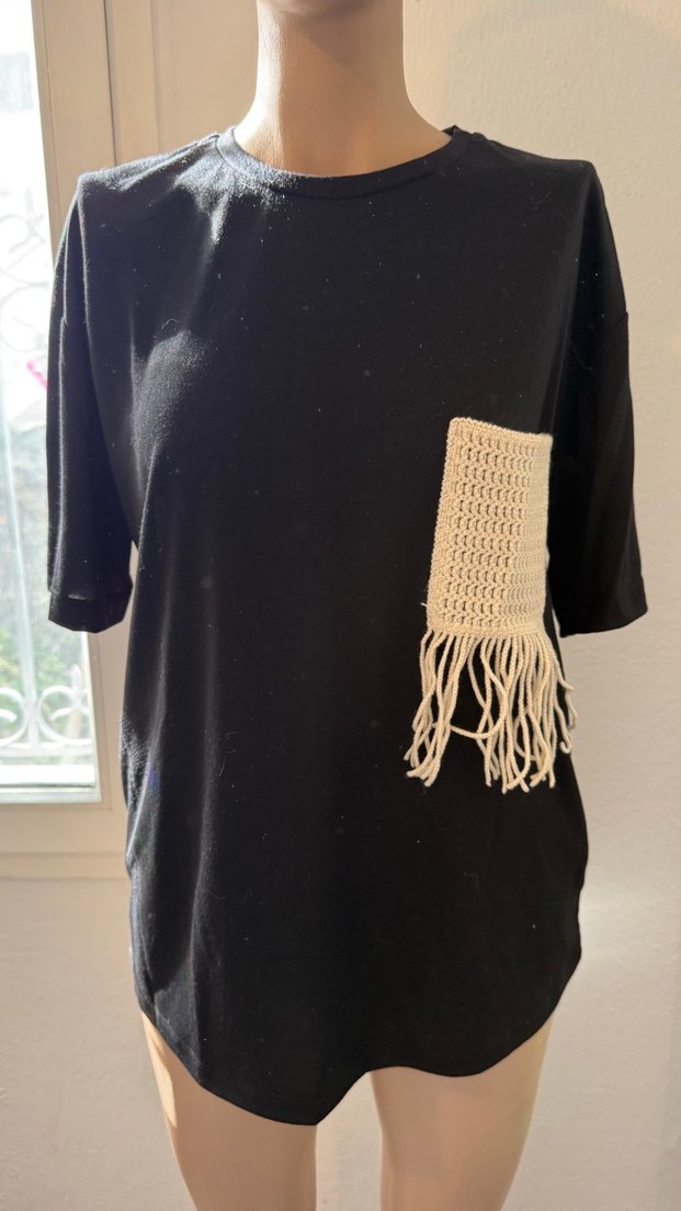 Örgü kumaştan, bohem tarzda siyah kısa kollu hamile tişörtü. Salaş kesim ve örgü püsküllü cep detayı bulunur.