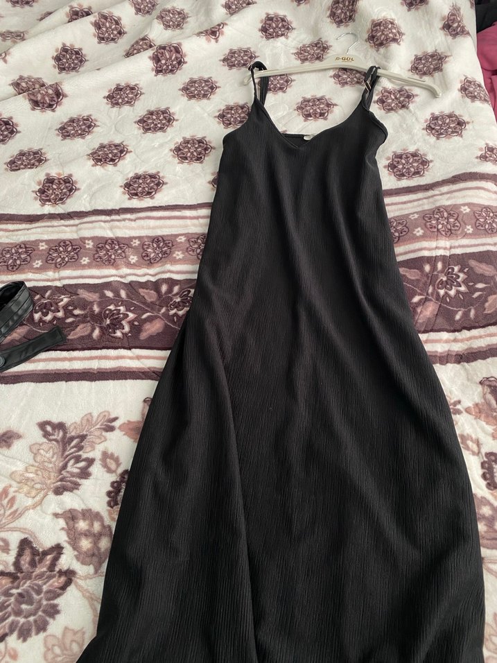 Yumuşak keten kumaştan, kolsuz ve drapeli, bol kesim siyah uzun elbise. Straplez yakası ile bohem ve Paris tarzı günlük kullanıma uygun.
