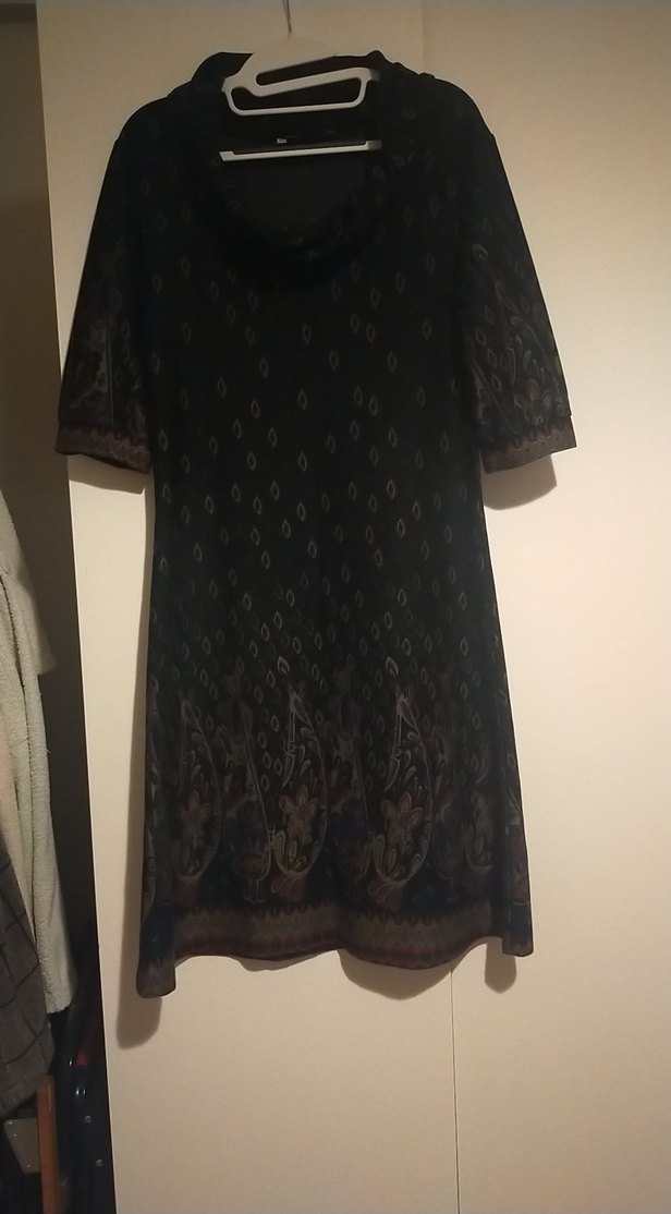 Siyah midi boy, kısa kollu, yakalı, desenli bohem tarzda, drapeli ve bol kesim elbisedir. Ofis kullanımı için uygundur.