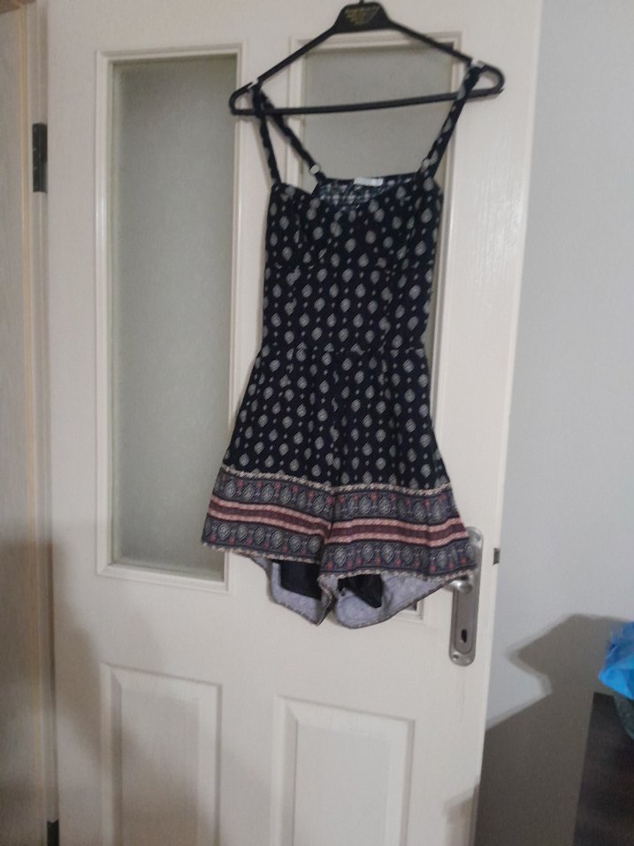 Bohem tarzda, bağcıklı detaylı, siyah mini tulum. Askılı, straplez yaka ve rahat kesim. Koyu renkli batik desenli, sentetik kumaştan.