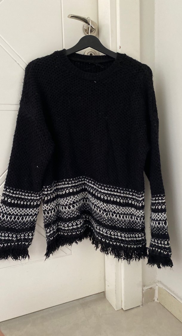 Bu kadın kazak bol kesim, uzun kollu ve yuvarlak yaka olarak örülmüştür. Siyah ve beyaz desenli, bohem tarzda, günlük kullanıma uygun rahat bir parçadır. Normal midi boyda ve püsküllü kenarlara sahiptir.