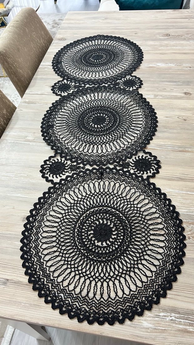 Bohem tarzda, siyah örgü runner dairesel detaylarla sanatsal bir görünüm sağlar.