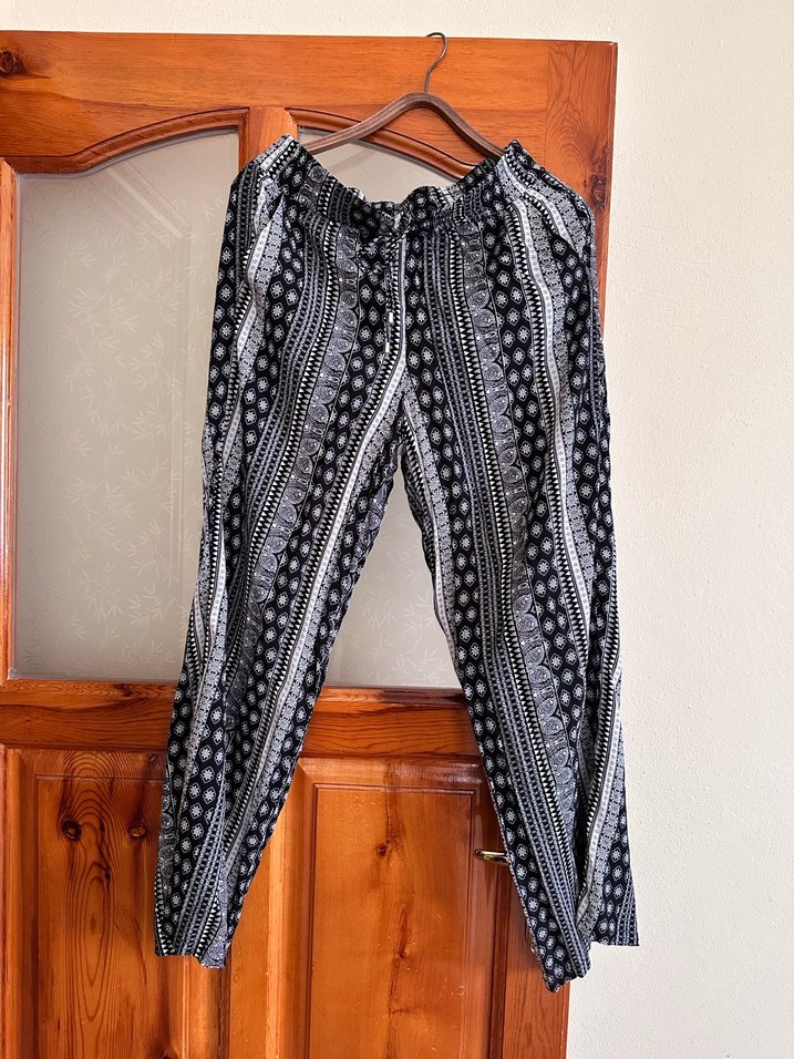 Bol kesim, uzun boylu bohem tarzda, pilili ve siyah batik desenli sentetik kumaştan yapılmış pantolon. Günlük kullanıma uygun.