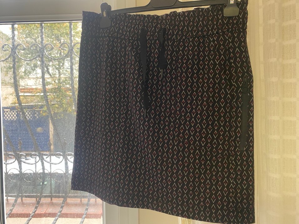 Siyah renkli, gevşek kesimli ve piliseli tasarıma sahip hamile eteği. Hafif elmas desenli, rahat ve bohem tarzda günlük kullanıma uygun.