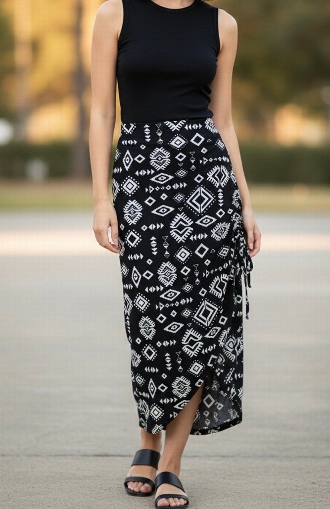 Bohem tarzda, bağcıklı detaylı, siyah uzun etek. Sentetik kumaştan, bol kesim ve batik desenlidir. Açık hava kullanımı için uygundur.