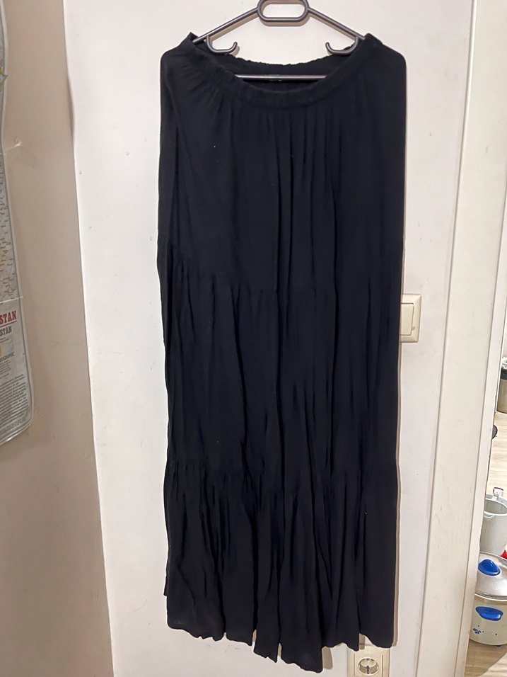 Bu siyah uzun etek, keten kumaştan, bol kesim ve pileli tasarıma sahiptir. Bohem tarzını yansıtır, günlük kullanım için uygundur.
