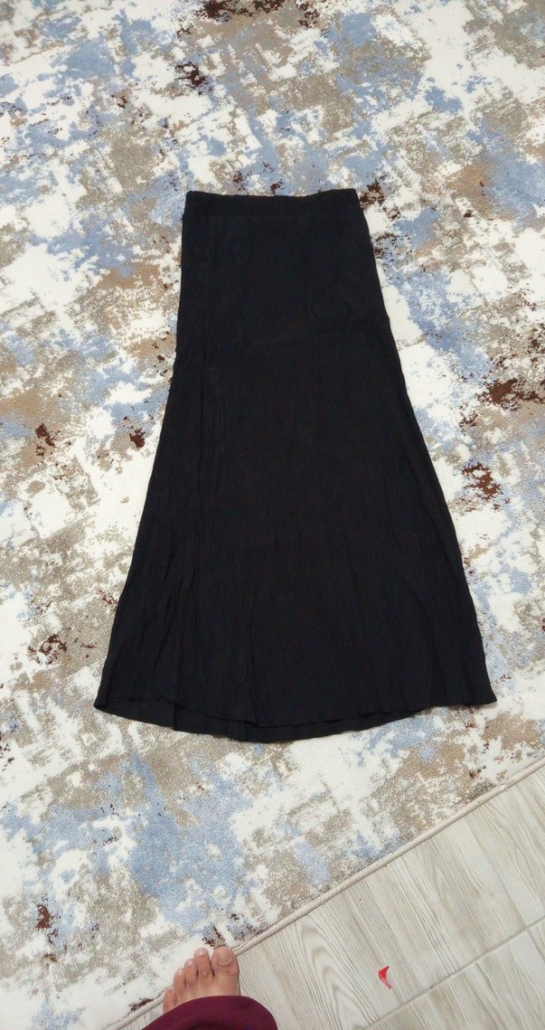 Siyah uzun keten etek, bol kesim ve drapeli tasarımıyla rahat bohem stil sunar, günlük kullanım için uygundur.