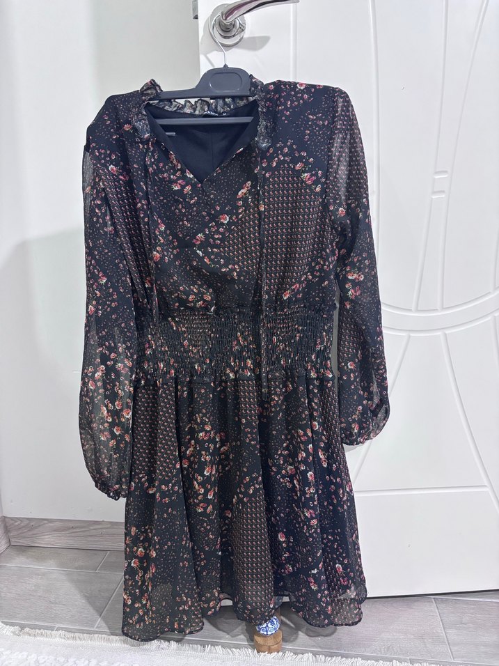 Bu siyah bohem elbise uzun kollu, bol kesim ve uzun boydadır. V yaka, batik desen ve kemerli bel detayına sahiptir. Günlük kullanım için uygundur.