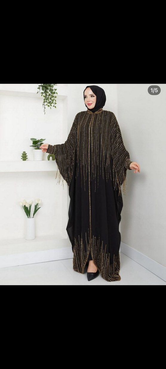 Bohem tarzda, drapeli etnik desenli, uzun kollu ve salaş kesim siyah abaya mütevazı bir modeldir. full boncuk işlemedir