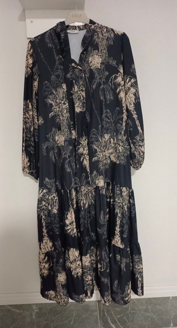 Hiç giyilmedi 42-44 beden aralığında Bu uzun siyah elbise, bol kesim, yüksek yakalı ve uzun kolludur. Koyu tie-dye desenli, dökümlü tasarımıyla bohem ve retro tarzını yansıtır. Günlük kullanım için uygundur.