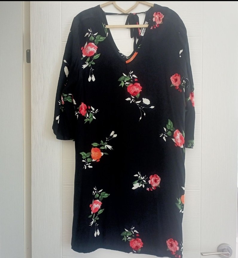 Siyah, V yakalı, bol kesim midi elbise, kısa kollu ve drapeli, çiçek desenli, romantik akşamlar için uygun .
