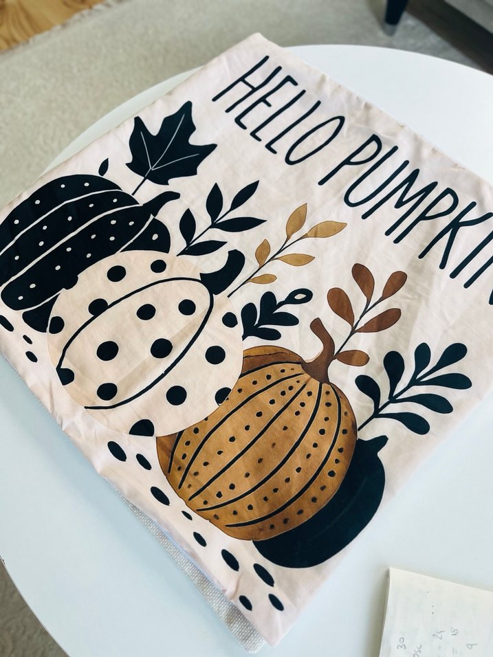 Bohem tarzda, koyu tonlarda çok renkli baskılı balkabağı desenli minder kılıfı, "Hello Pumpkin" yazılı. #sonbahar #balkabagi #pumpkin #sonbahar