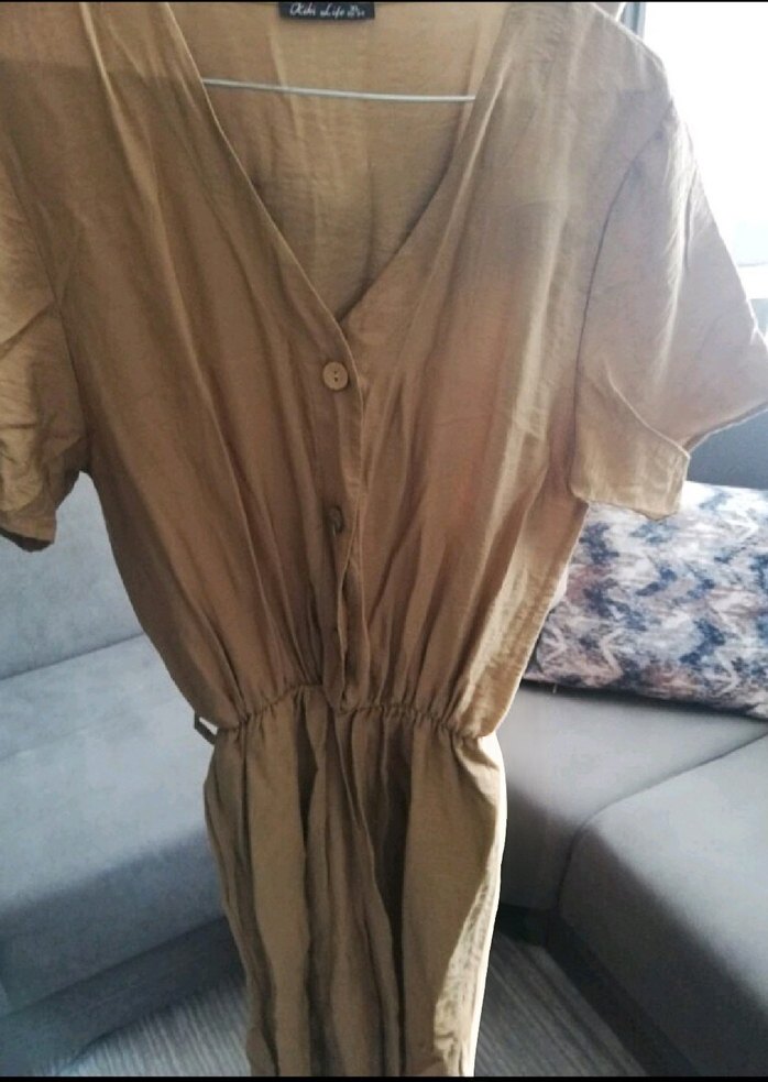 Bej keten kumaştan, kısa kollu, V yakalı, düğmeli ve beli büzgülü bol kesim bohem şort tulum. Rahat ve gündelik kullanım için uygun.