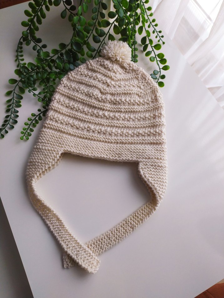 Bej renk, kulaklıklı ve ponponlu, yumuşak dokulu bohem stil örgü bebek bere. sipariş aliyorum fiyat sorunuz