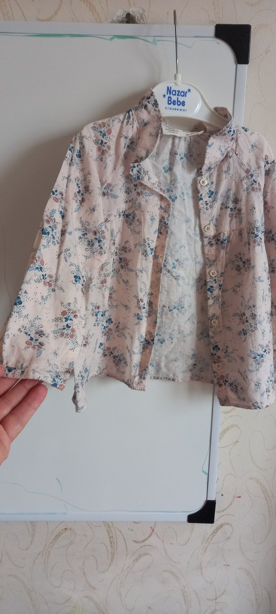 Pamuklu, bol kesim, uzun kollu kız gömleği. Yakalı ve düğmeli, bej renkli pastel tonlarda, çiçek desenli.