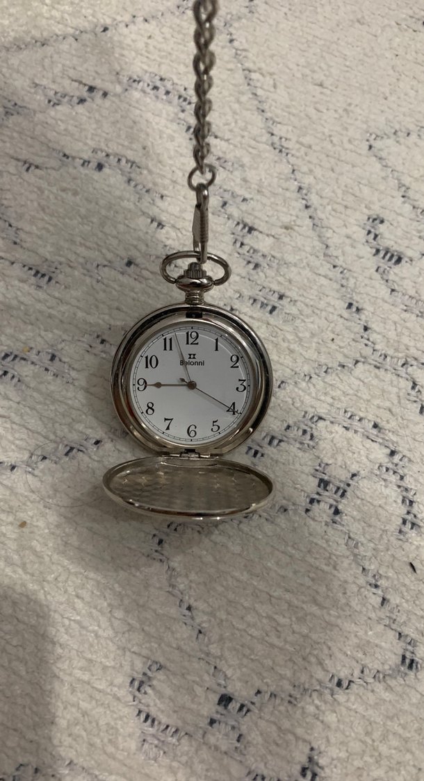 Bohem tarzı erkek cep saati, beyaz kadran ve siyah rakamlarla. Gri metal kasa, zincir ve koruyucu kapaklı. Saat 10'u gösteriyor. ⌚