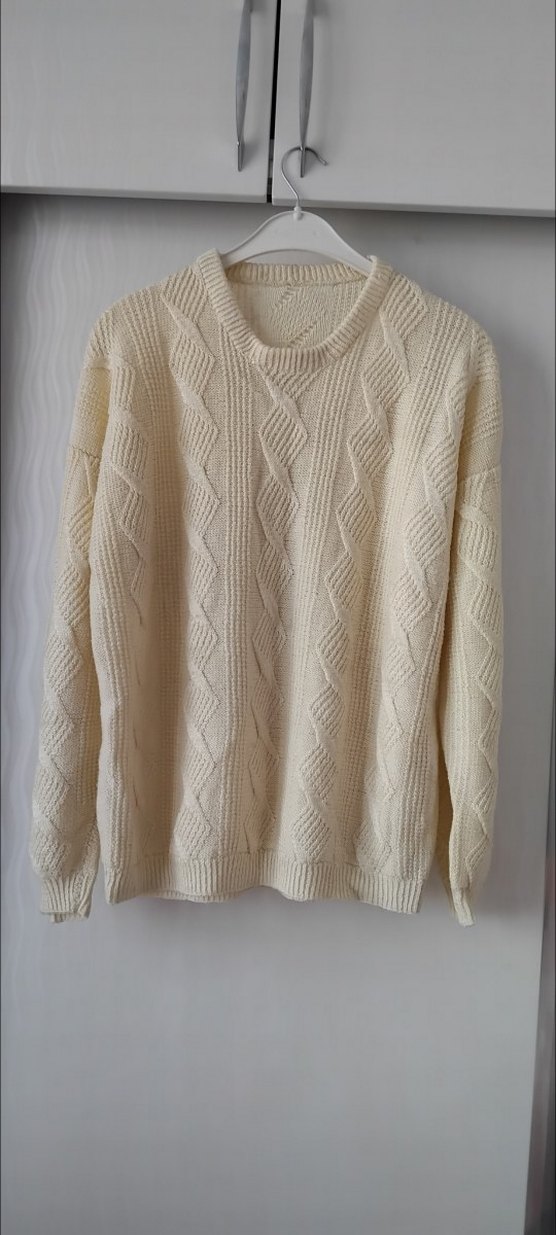 Beyaz renkli, uzun kollu ve yuvarlak yakalı örgü kazak, bol kesimi ve midi boyuyla rahat ve bohem bir tarz sunar. Günlük kullanıma uygundur.