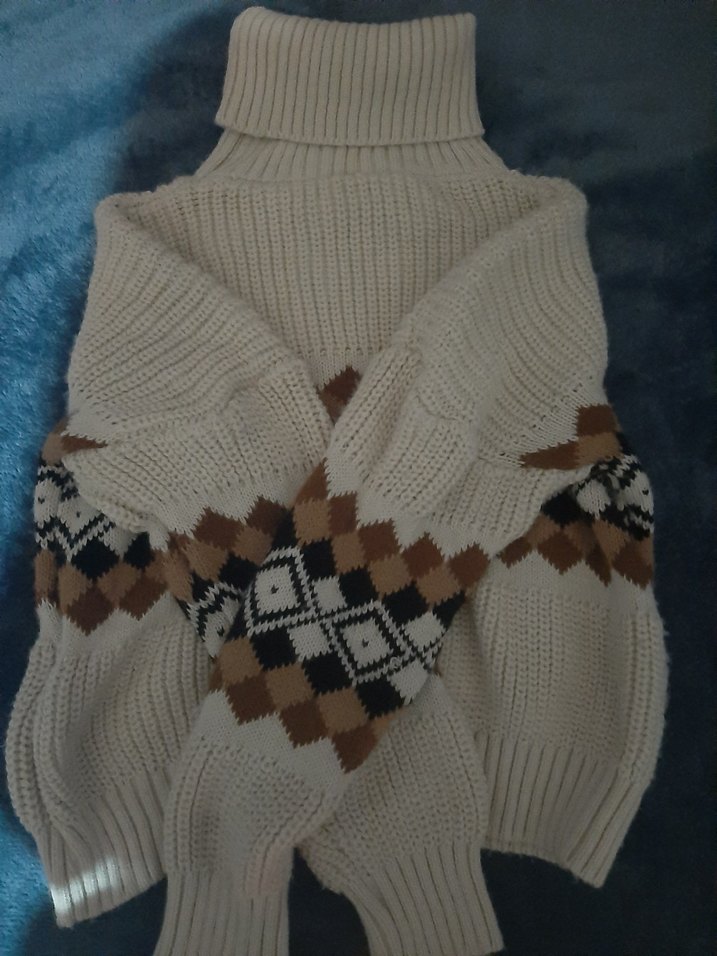 Boğazlı ve uzun kollu, gevşek kesim beyaz örgü kadın kazak. Kısa boyda, bohem tarzda ve gri-kahverengi baklava desenli. Rahat günlük kullanım için uygundur.
