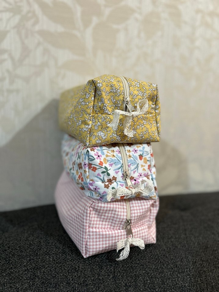 Bohem tarzda, pastel renklerde çiçek ve kareli desenlere sahip, fermuarlı ve kurdele süslemeli tekstil makyaj çantaları. Satın almadan önce ilan açtırınız. Adet fiyatı.