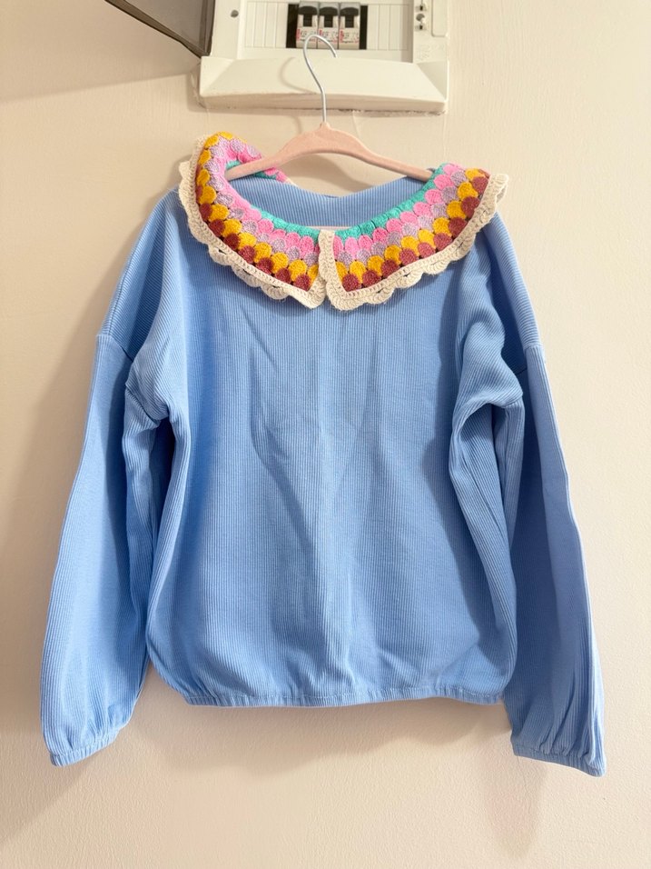 Pastel mavi renkli, örme kumaştan yapılan, bol kesim ve uzun kollu kız sweatshirtü. Çok renkli nakışlı, tığ işi detaylı yakasıyla bohem tarzını yansıtıyor.