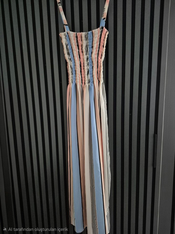 Bu uzun elbise, pilili detaylar ve askılı.Pastel tonlarda batik desenlidir.