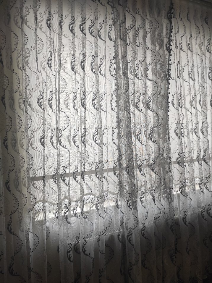 Bohem stil gri ve beyaz tonlarda, desen içermeyen ince tül perde. Hafif kumaşıyla yumuşak ışık geçirir.