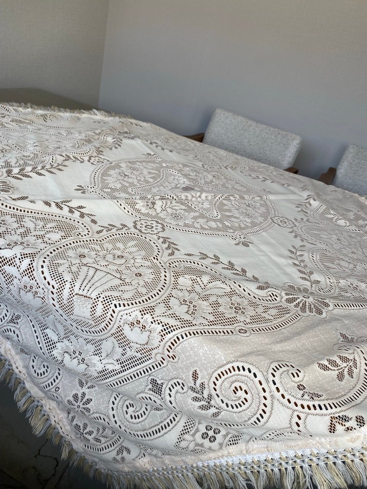 Bu beyaz masa örtüsü, işlemeli detayları ve bohem tarzıyla dikkat çekiyor. Uçlarında ince püsküller bulunur.