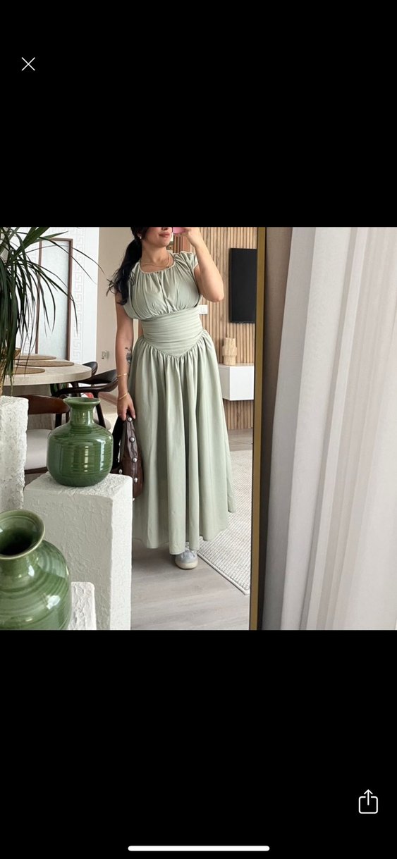Bohem tarzda, keten kumaştan, pastel haki renkli, pileli detaylı, askılı kollu ve kayık yaka uzun salaş elbise.
