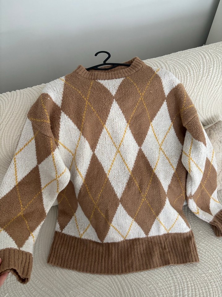 Bohem Stil Kahverengi Baklava Desenli Kazak