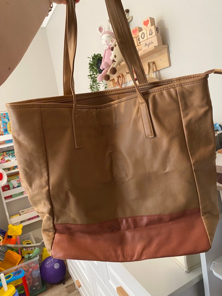 Kahverengi deri kadın çantası, fermuarlı kapama ve minimalist bohem tarzıyla dikkat çekiyor. Pastel tonlarda, desensiz ve şık bir görünüme sahip.