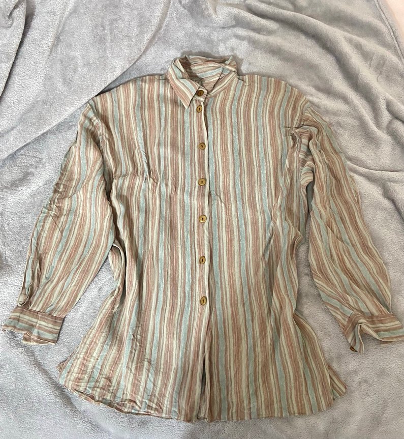 Mavi, kahve keten kumaştan, uzun kollu, yakalı ve düğmeli bohem tarzda çizgili kadın gömleği. Gevşek kesim ve pastel çizgili vintage tasarım. Buradan aldım bana olmadı. L beden ama daha S-M gibi geldi bana.