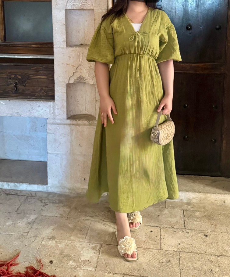Bohem Stil Khaki Uzun Keten Elbise