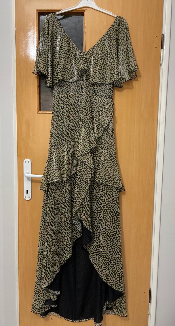 Yılan desenli, ruffle detaylı, bol kesim uzun khaki elbise. Askılı kollu ve V yaka, şık bir parti kombini için ideal.