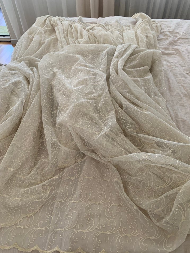 Bohem tarzda Krem tül perde, zarif kıvrımlı nakışlarla süslenmiş, mekana hafif ve şık bir hava katıyor. Genişlik: 2.35 uzunluk 2.65