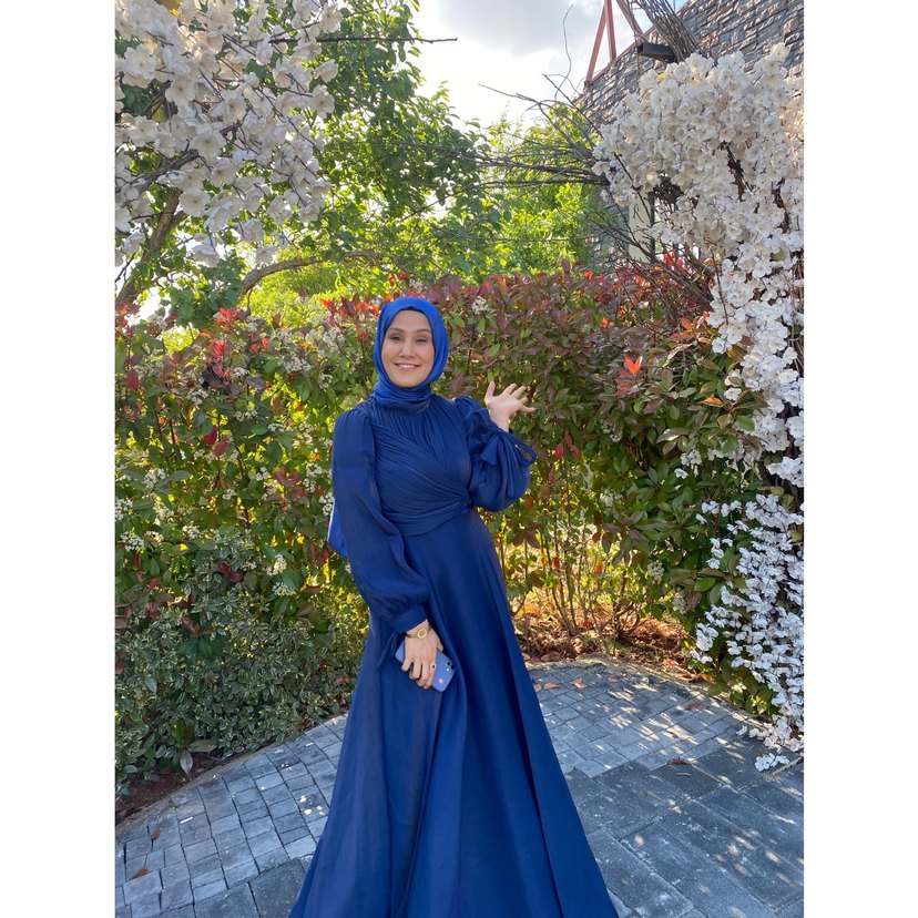 Lacivert renkte, yüksek yakalı, uzun kollu ve bol kesim olan bu uzun abiye elbise, drapeli detaylara sahiptir. Tie-dye deseniyle bohem tarzını yansıtır, düğünler için uygundur.