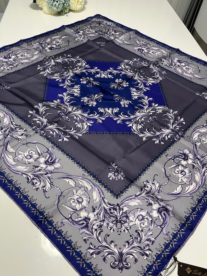 Koyu mavi, drapeli tasarıma sahip, bohem desenli, yumuşak sentetik kumaştan kadın fular. Sade ve zarif kullanım için uygun.
