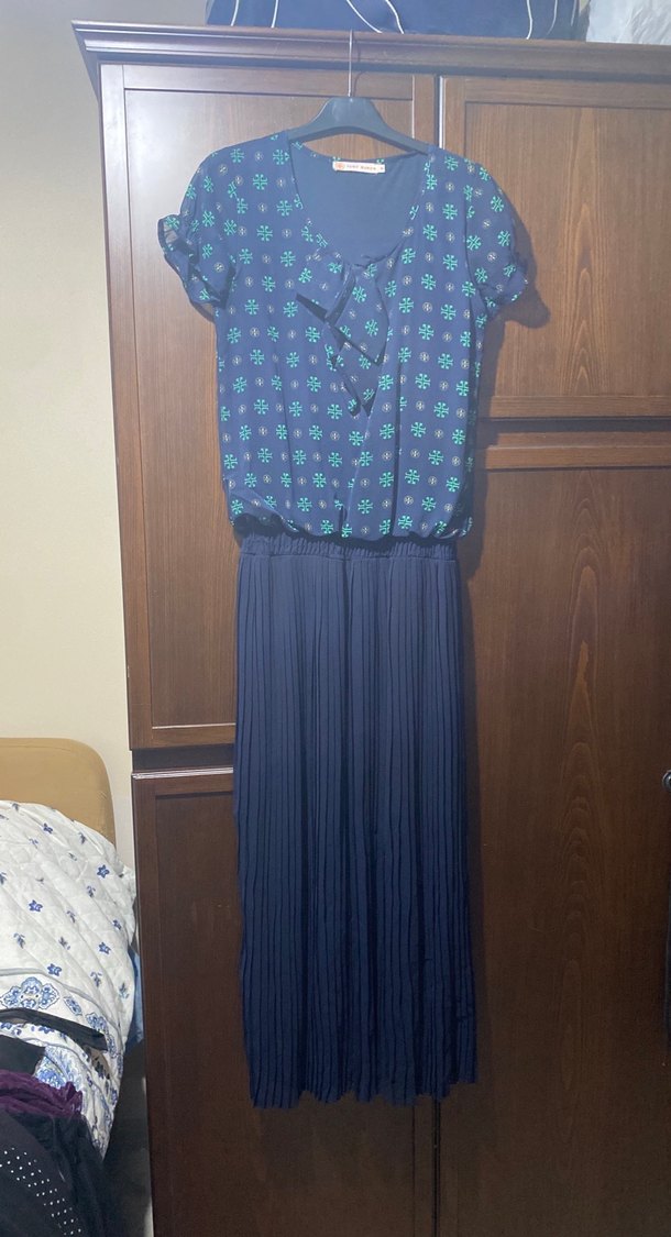 Bu uzun mavi elbise, bol kesim, pilili detaylar ve kısa kollara sahiptir. Yuvarlak yaka ve batik desenli, yumuşak sentetik kumaştan yapılmıştır, bohem tarz için uygundur.