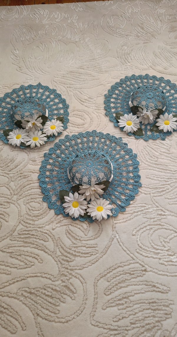 Mavi örgü deseni ve beyaz papatyalarla süslenmiş bohem tarzda el yapımı dekor seti.