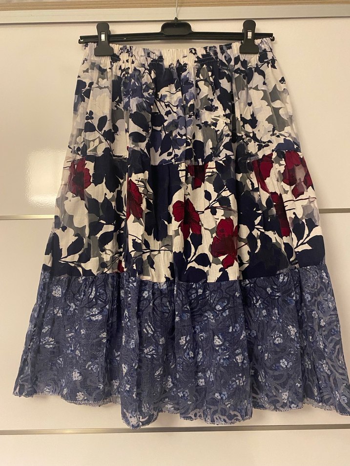 Bohem stil midi uzunlukta, bol kesim ve fırfır detaylı, koyu mavi desenli tekstil kumaştan kadın eteği. Günlük kullanım için uygundur.
