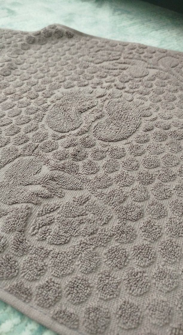 Bohem tarzda, gri renkte ve yılan desenli dokulu bir havludur.