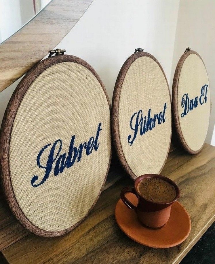 Bohem stilinde, dokulu kumaş ve el yazısı tarzında mavi yazılı nakış kasnakları. Dekoratif kullanım için uygundur. İstediğiniz modelden yaparım