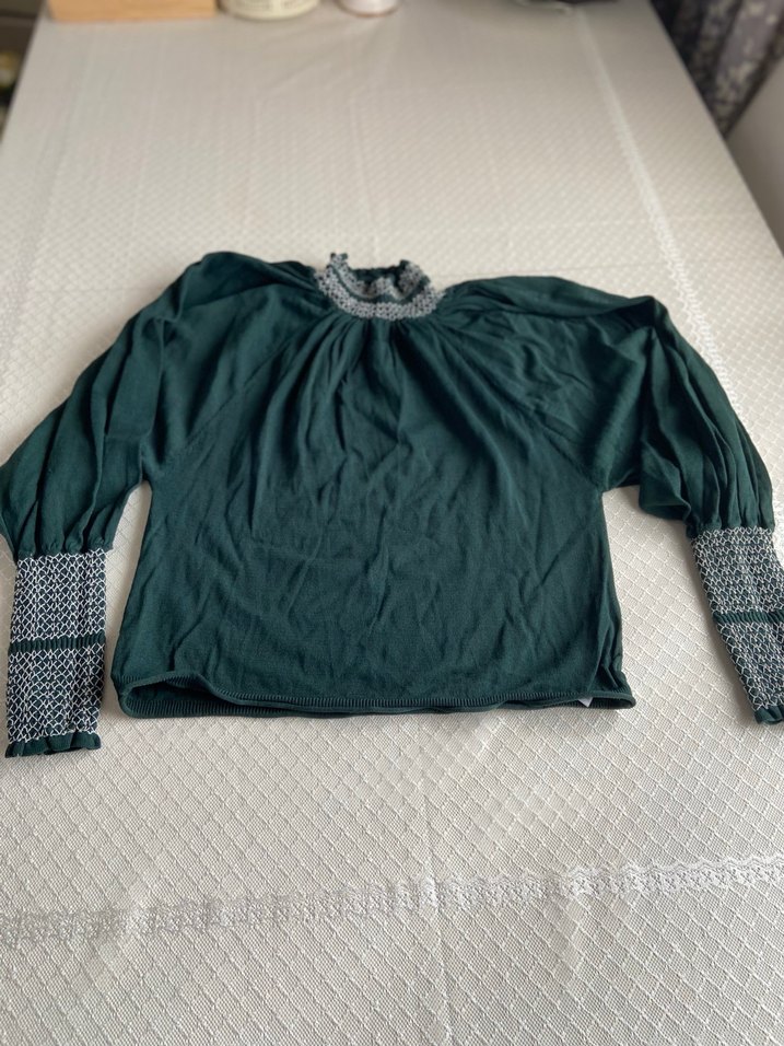 Yeşil renkli kadın bluz, uzun kollu ve yuvarlak yakalıdır. Örgü detayları yakada ve kollarda bulunur, rahat ve bohem bir tarza sahiptir. Günlük kullanım için uygundur.