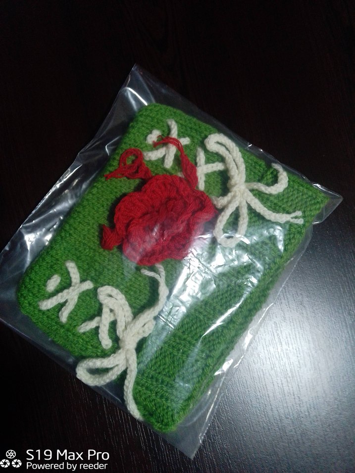 Yeşil ipten örülmüş, beyaz ve kırmızı bağcık detaylı bohem tarzı el yapımı Bere..