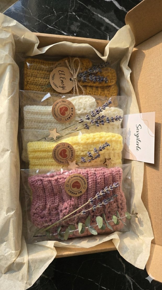 Bohem tarzda, farklı renklerde örgü eldiven seti, kuru lavanta ve ahşap yıldız süslemeli, 'Sevgilerle' notu ile birlikte.
