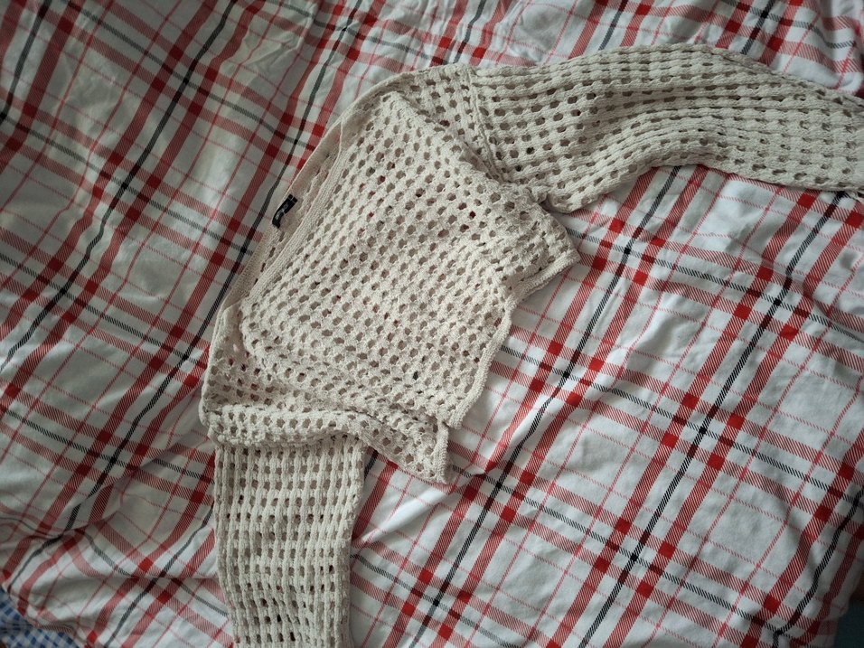 Beyaz renkli, örgü dokulu, bol kesim ve tekne yaka uzun kollu kadın kazak, midi boyda, rahat sokak stili için uygundur.